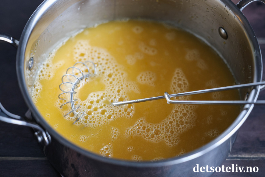 La blandingen småkoke mens du visper for hånd, helt til du ser at den begynner å tykne.