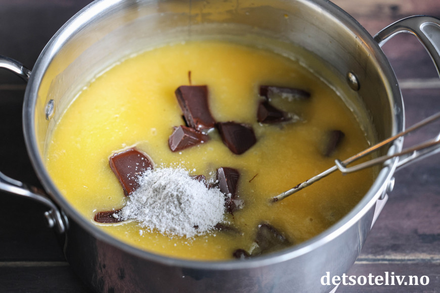 Ta kjelen av platen og tilsett oppdelt kokesjokolade, smør og vaniljesukker.