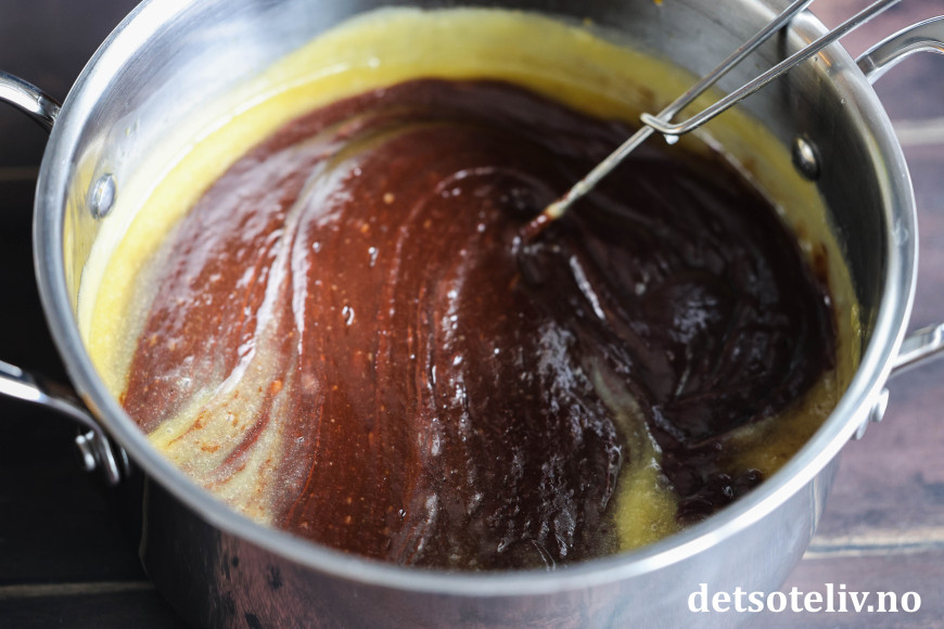 Smelt smøret i en kjele sammen med vann, kakao og vaniljesukker. Ta kjelen av platen.