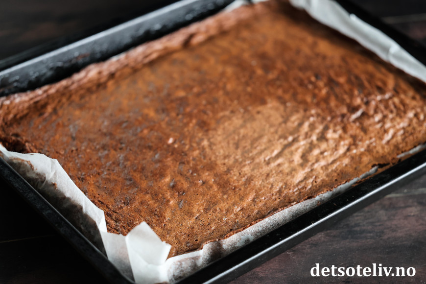 Ha deigen i en stor, bakepapirkledd langpanne (ca. 30 x 40 cm). Stek kaken midt i ovnen ved 180°C i ca. 35 - 40 minutter (sjekk at den er helt gjennomstekt før du tar den ut av ovnen). Avkjøl kaken i langpannen før du hvelver den ut og drar av bakepapiret.