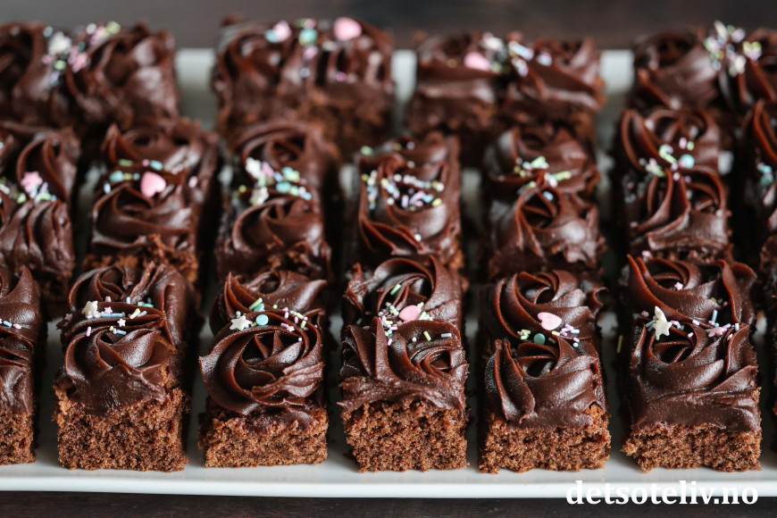 Renskjær kantene på kaken og del den opp i firkanter. Pynt hver kakebit med kakestrøssel.