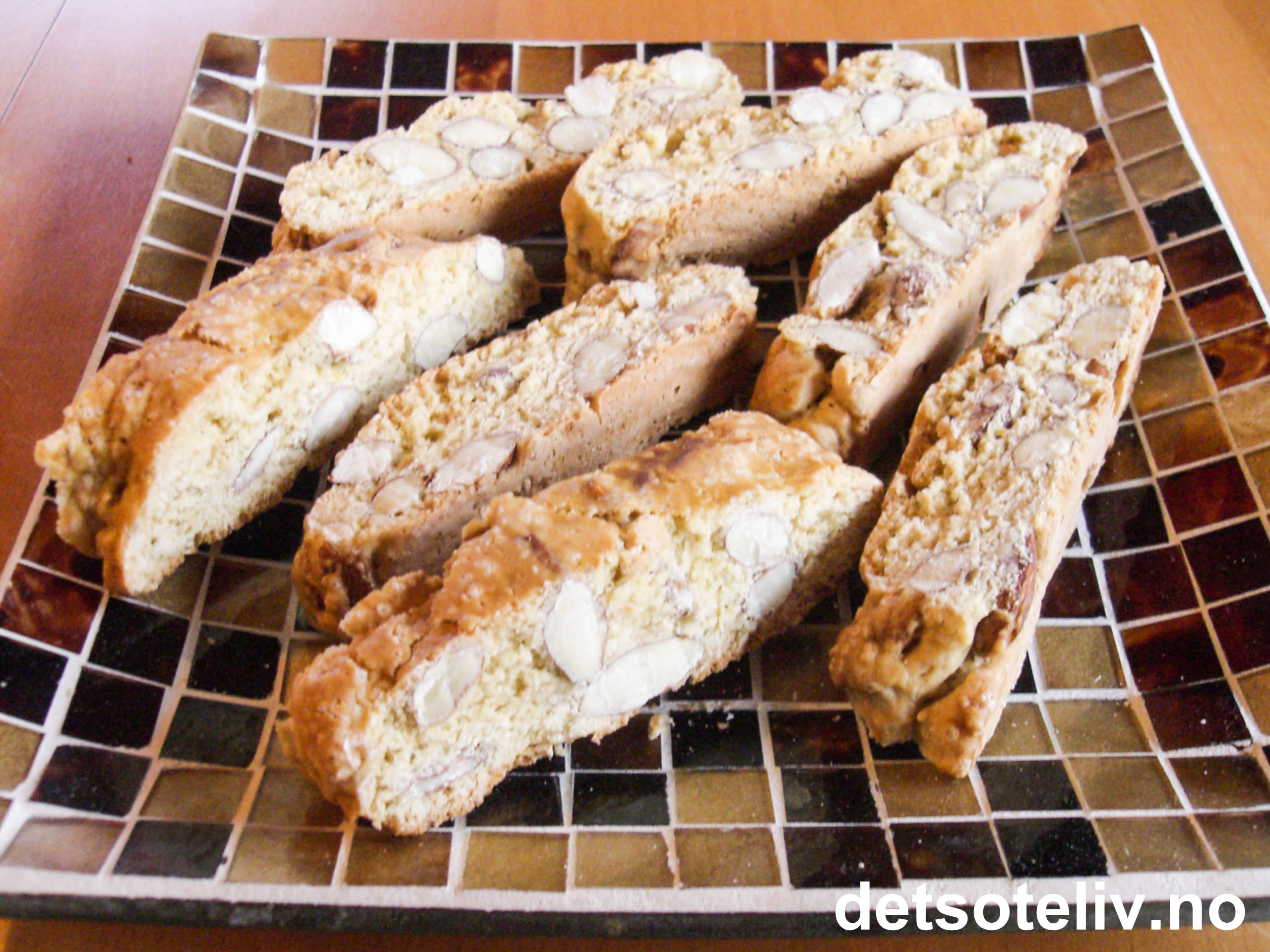 Stekes midt i ovnen ved 200°C i ca 30 min. Ta platen ut av ovnen og senk varmen på ovnen til 120°C. Avkjøl kakene i 20 min. Skjær så stengene opp på skrå i skiver på ca 1 cm. Bruk en stor og skarp kniv. Legg kakene med snittflaten opp og la dem tørke i ovnen ved 120°C i ca 45-50 min. Vend på dem når halve tørketiden har gått.