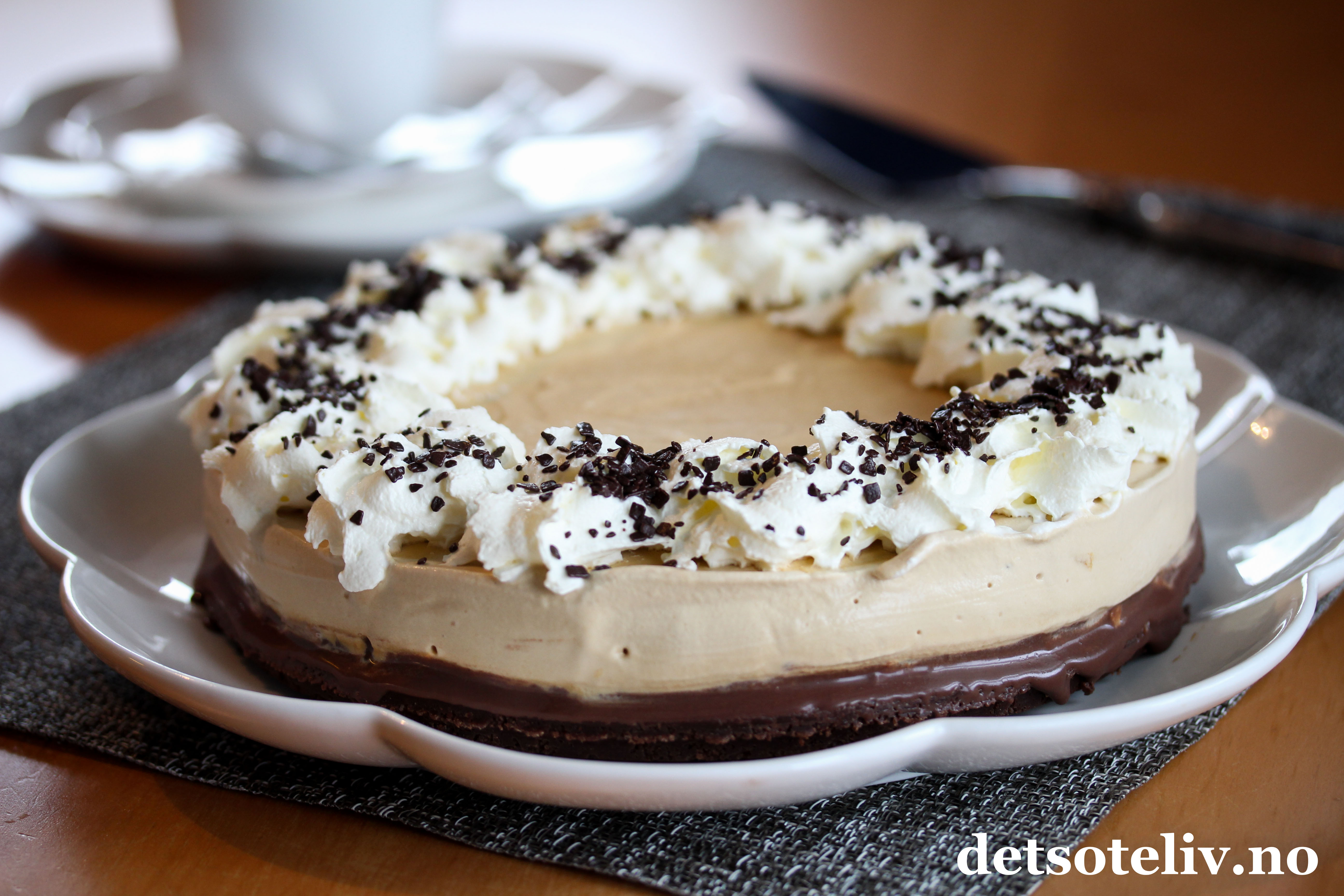 Iskaken består av en deilig sjokoladekjeksbunn, et spennende lag med mørk og fyldig sjokoladetrøffel og nydelig fløteiskrem med kaffesmak. Kaken pyntes med pisket krem og cappuccinodryss på toppen.