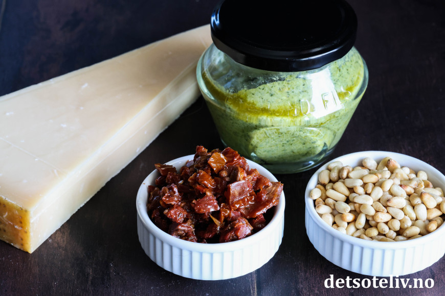Start med å lage hjemmelaget pesto (se eget innlegg HER).