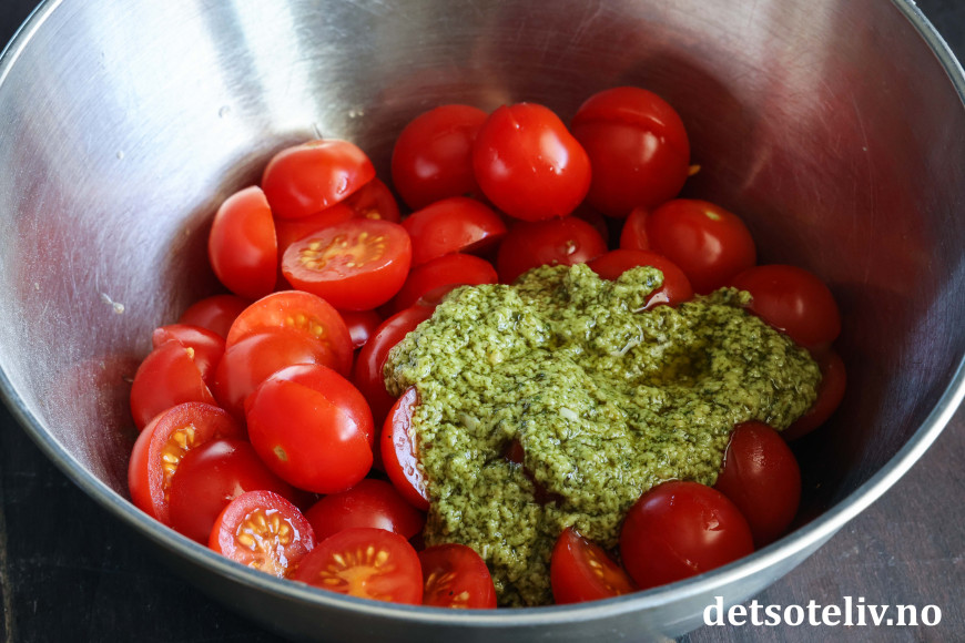 Skjær tomatene over på midten og ha i en bolle. Tilsett mesteparten av pestoen og vend om.