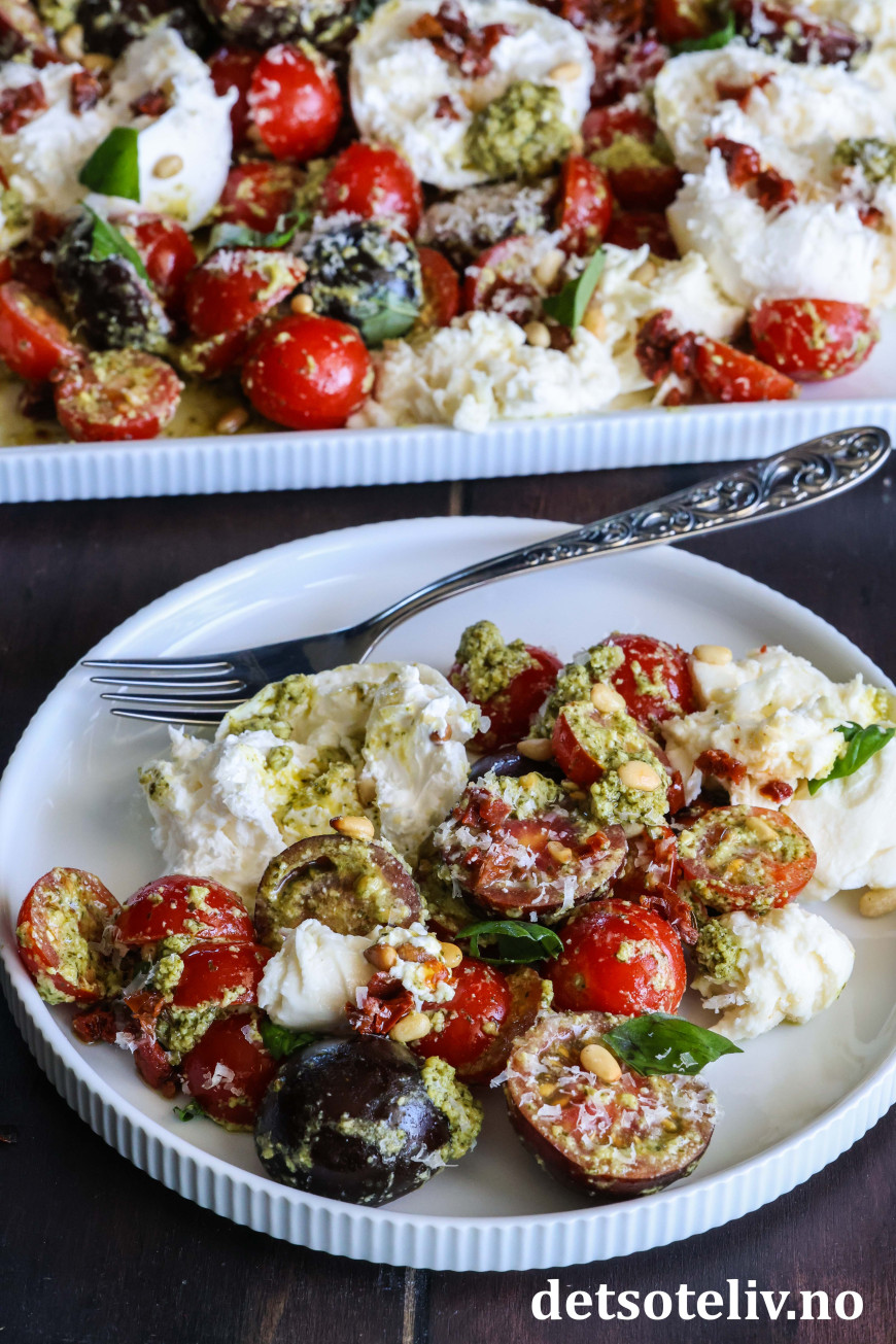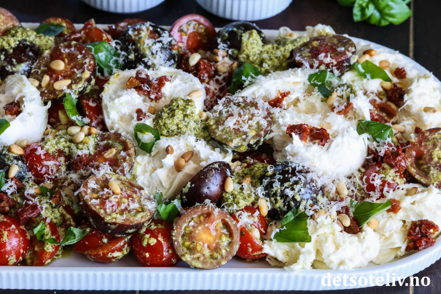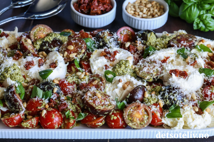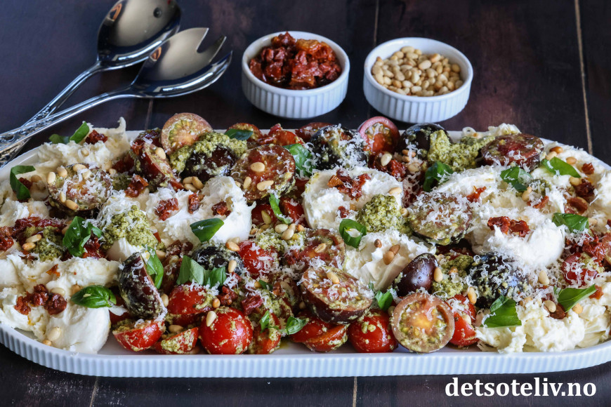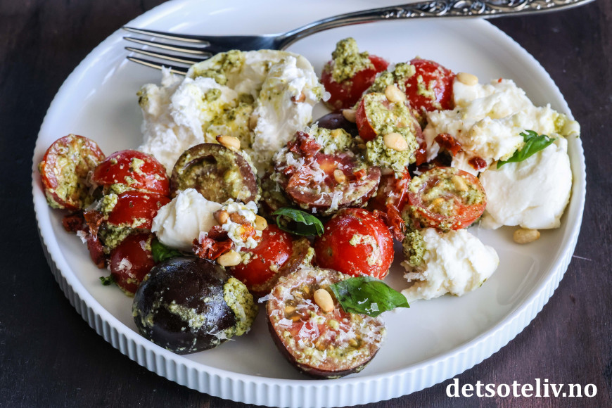 I denne versjonen er de gode smakene forsterket! Her er tomatskivene byttet ut med ekstra søte piccolotomater og Yoom-tomater med den lekre mørke utsiden, i tillegg til noen aromatiske biter soltørkede tomater. Fersk mozzarella brukes i kombinasjon med burrata, som har den bløte, kremete kjernen (stracciatella). I tillegg til basilikumblader brukes hjemmelaget pesto. Det hele toppes med ristede pinjekjerner og revet parmesan.