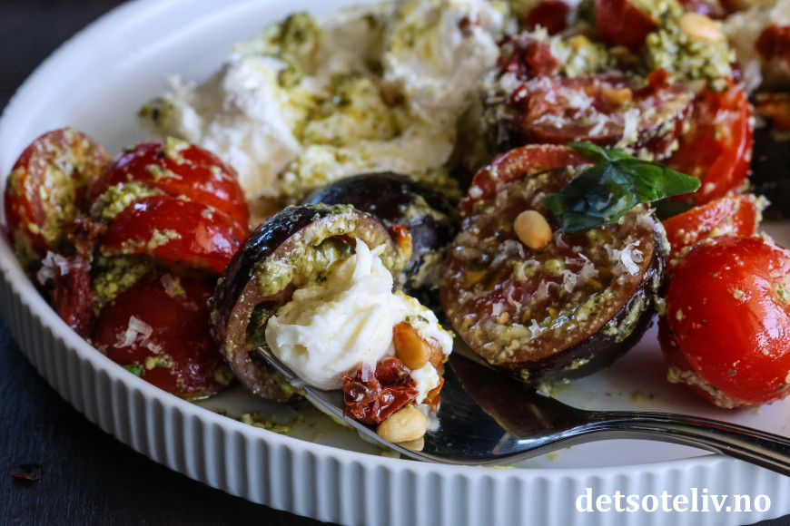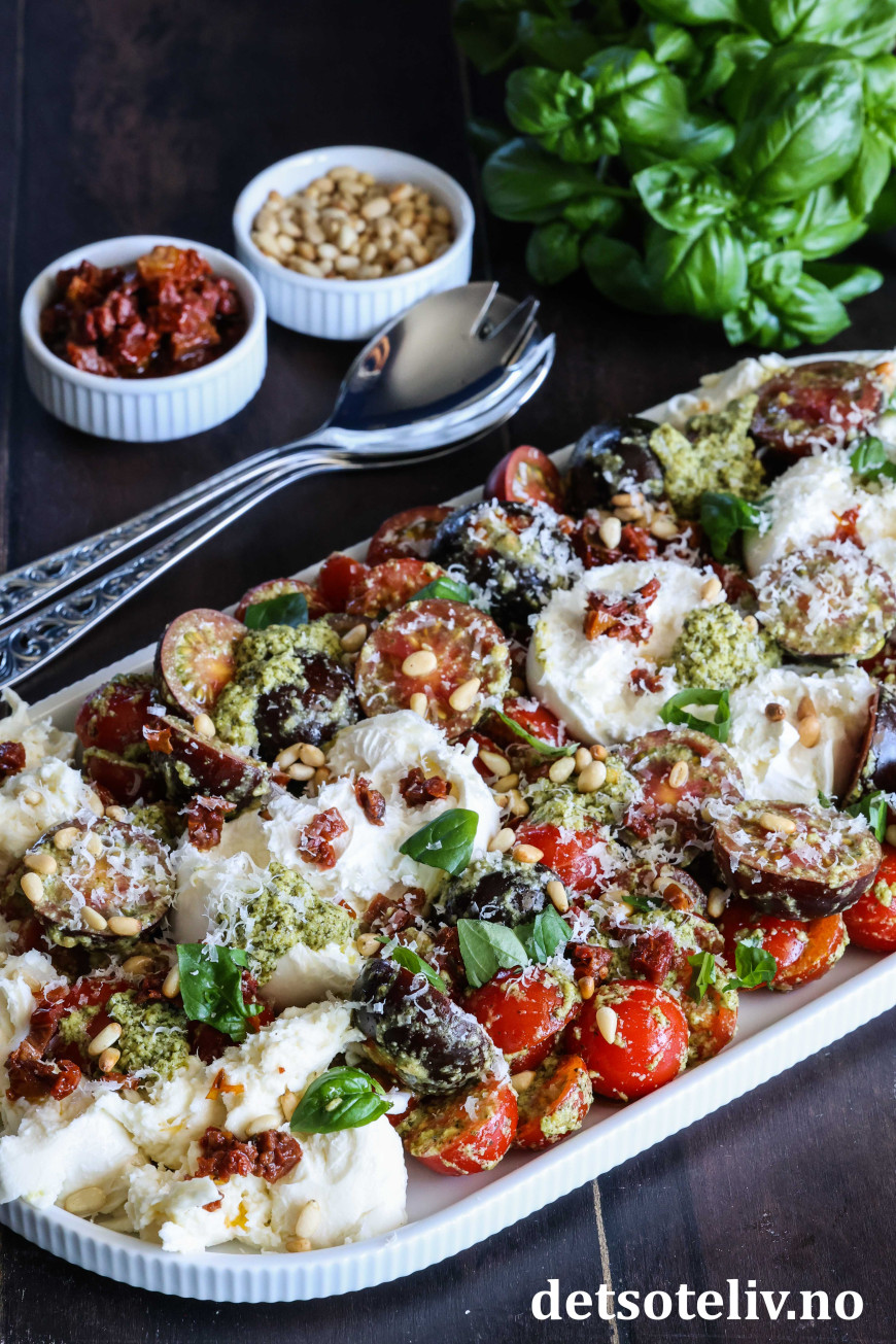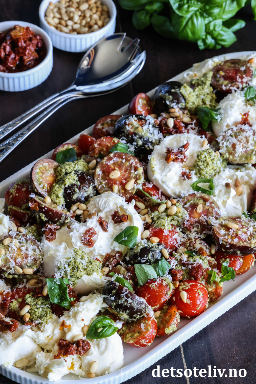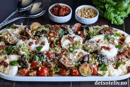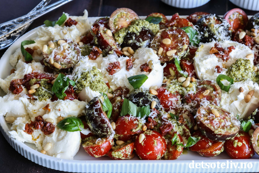 I denne versjonen er de gode smakene forsterket! Her er tomatskivene byttet ut med ekstra søte piccolotomater og Yoom-tomater med den lekre mørke utsiden, i tillegg til noen aromatiske biter soltørkede tomater. Fersk mozzarella brukes i kombinasjon med burrata, som har den bløte, kremete kjernen (stracciatella). I tillegg til basilikumblader brukes hjemmelaget pesto. Det hele toppes med ristede pinjekjerner og revet parmesan.