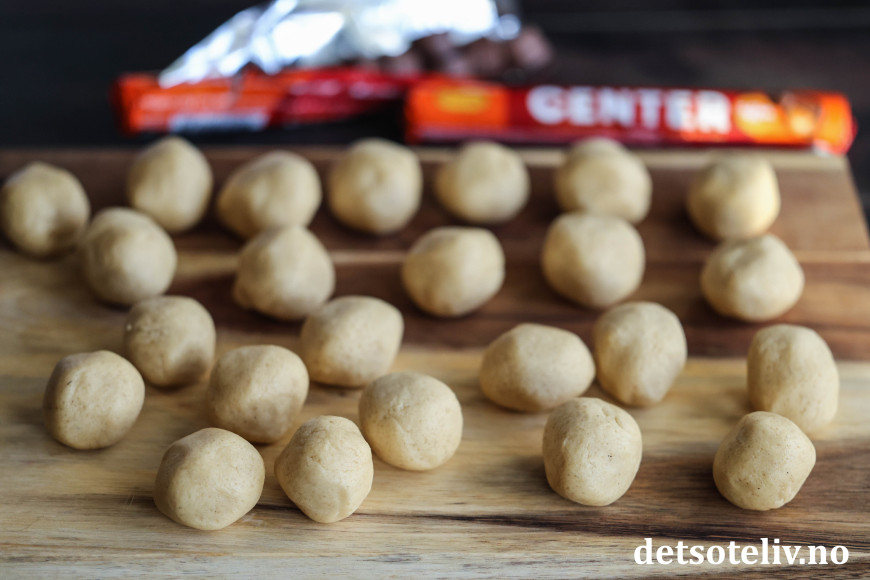 Del deigen i 24 like store biter. Rull bitene til kuler.