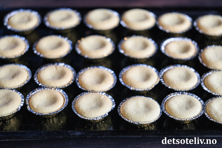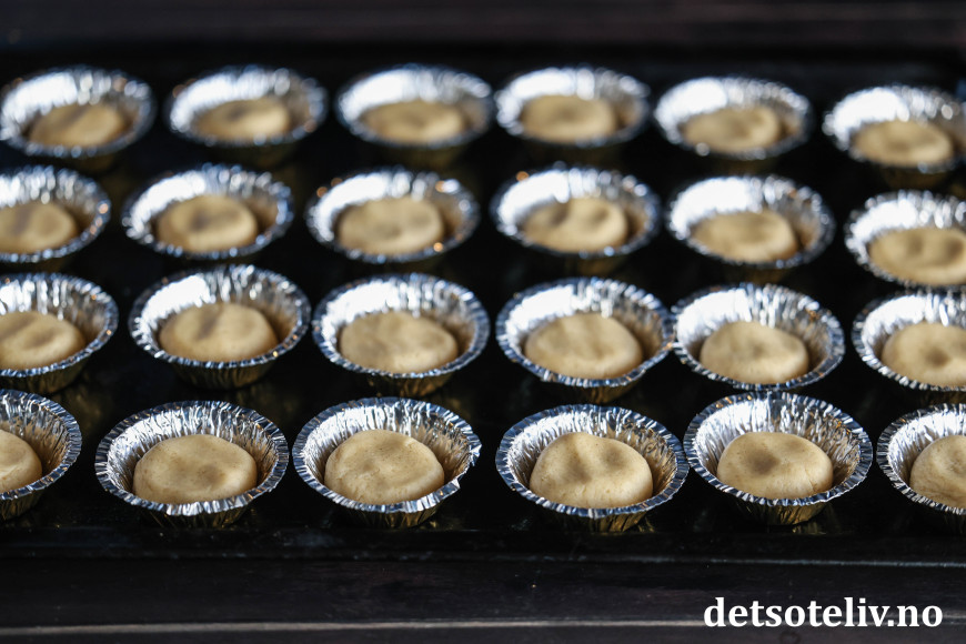 Del deigen i 24 like store biter. Rull bitene til kuler. Legg kulene i små muffinsformer og trykk de litt ned på toppen (se tips).