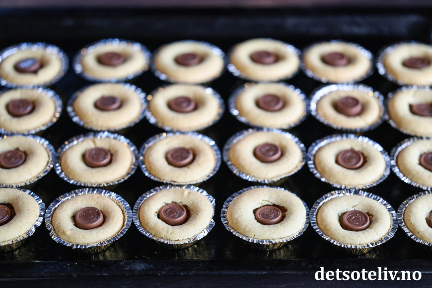 Trykk en Center-sjokolade ned i hver kake med en gang etter at kakene er tatt ut av ovnen. Sjokoladen vil da smelte litt i kantene slik at den fester seg inni kakene.