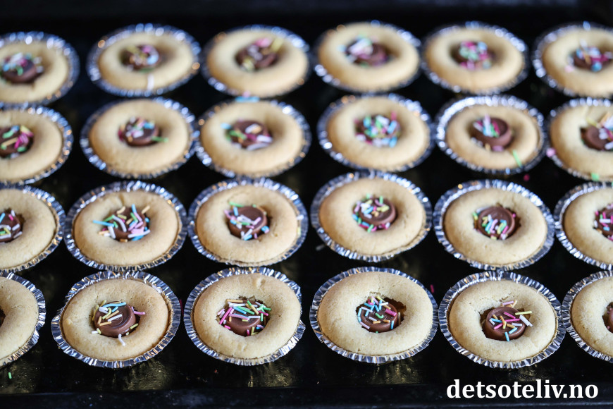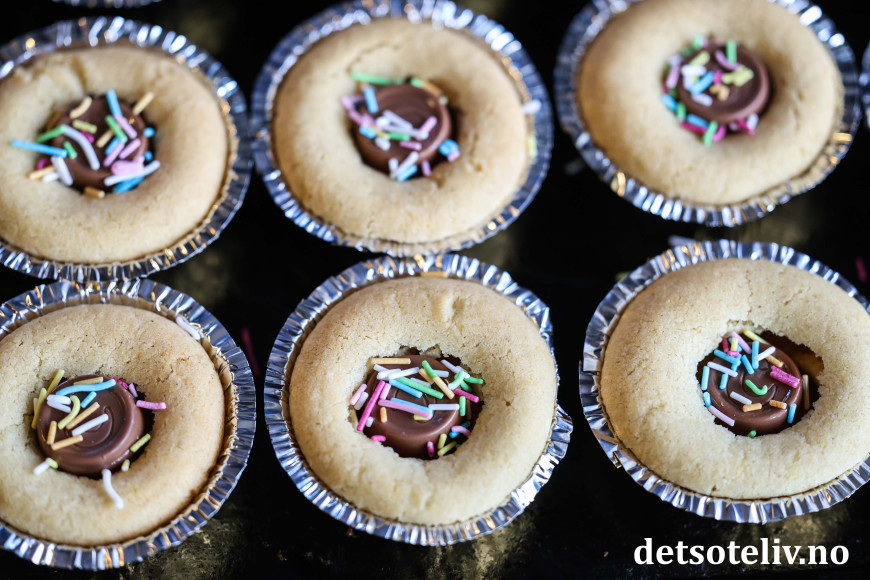 Legg kulene i små muffinsformer og trykk de litt ned på toppen (se tips).