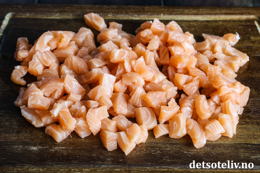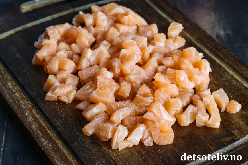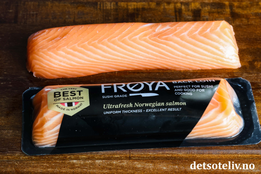 ♥ Jeg liker å bruke ryggfilet av laks (back loin). Siden laksen skal spises rå er det viktig at du bruker laks som er av sashimikvalitet (som altså kan spises rett fra pakningen).
