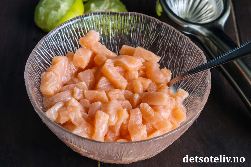 Skjær laksen opp i små terninger. Ha bitene i en bolle. Bland presset saft fra 2 lime sammen med litt sukker og salt. Ha dette over laksebitene og bland godt.