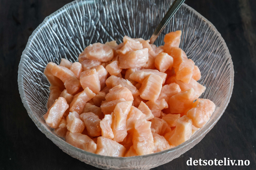 Dekk over med plastfolie og sett bollen i kjøleskapet i ca. 1 time. Vend litt om et par ganger i løpet av marineringsperioden. Du vil gradvis se at laksebitene får en hvitere farge som følge av marineringen i syren.