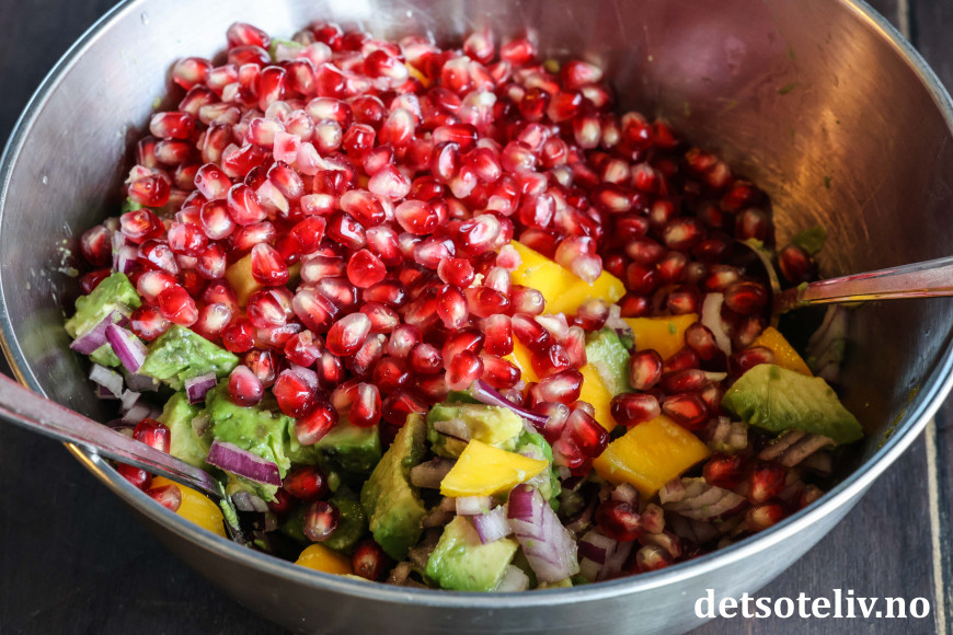 Når laksebitene er ferdig marinerte, blandes de inn i mangosalaten.