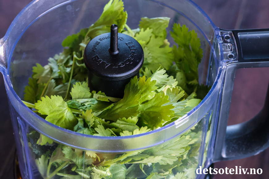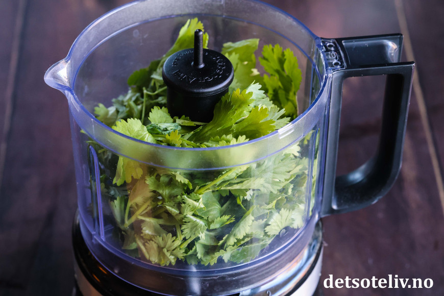 Ha korianderblader (og stilker) i en liten food processor. Tilsett olje og litt flaksalt, og kjør blandingen sammen til korianderbladene er fint most inn i oljen.