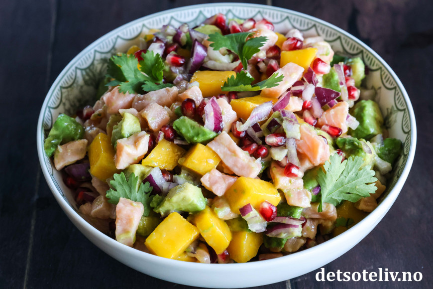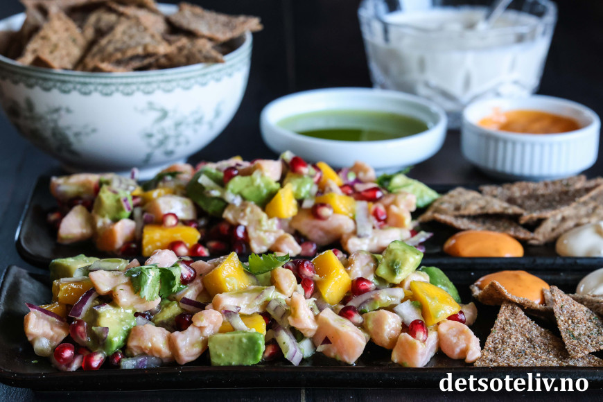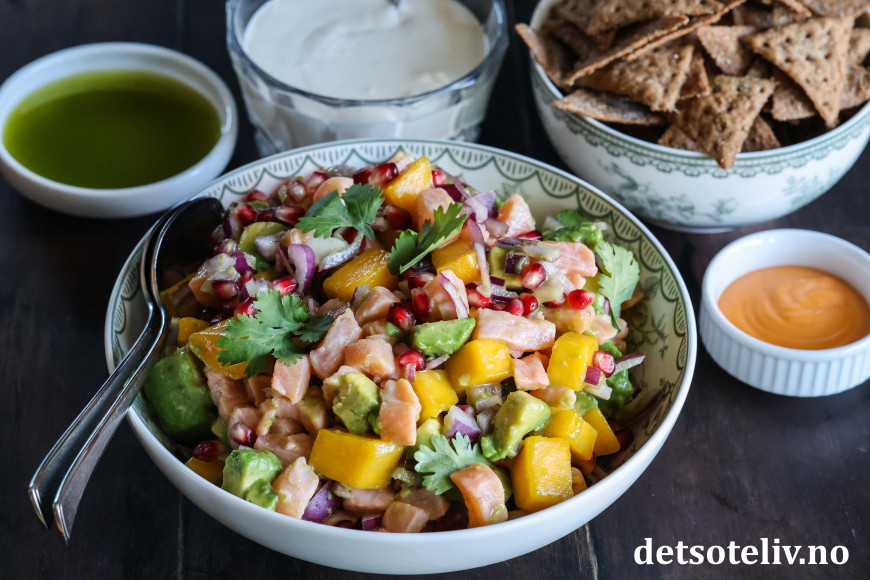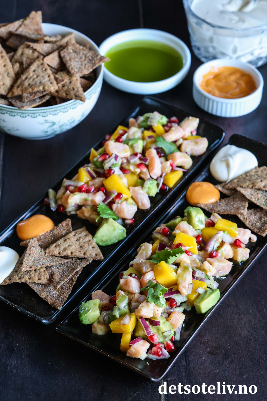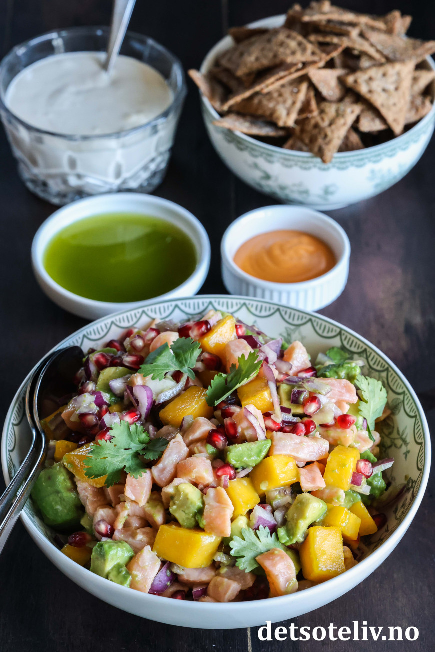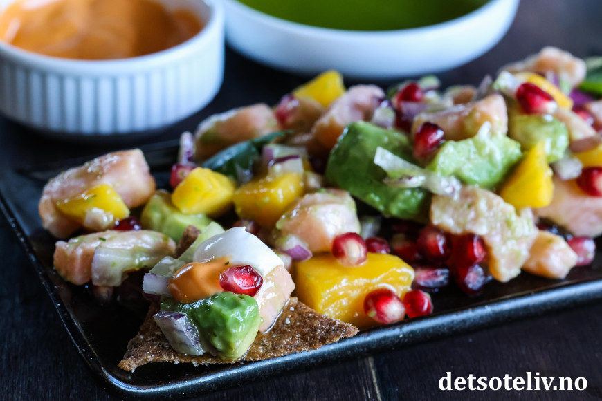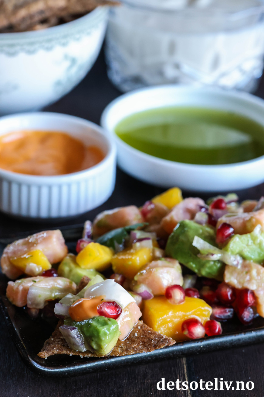 Ceviche kan lages med mange typer fisk. Her har jeg brukt laks, som blir fantastisk i kombinasjon med avokado, mango, rødløk, chili og granateplekjerner. Som tilbehør har jeg rømme, chilimajones og en herlig korianderolje.