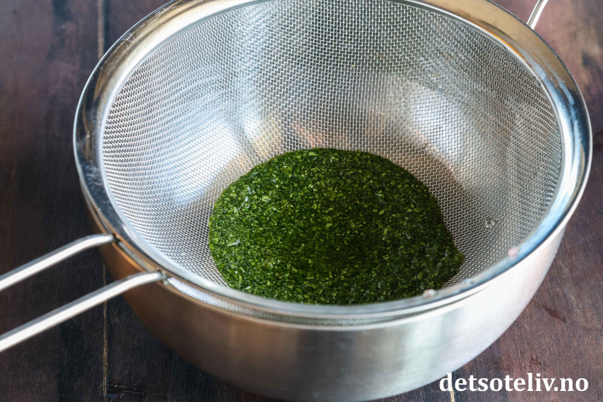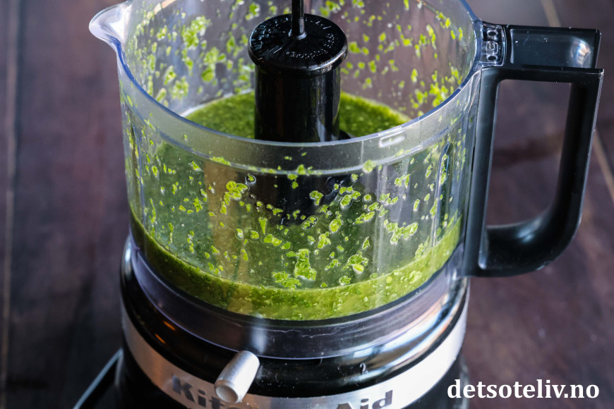 Tilsett olje og litt flaksalt, og kjør blandingen sammen til korianderbladene er fint most inn i oljen.