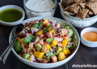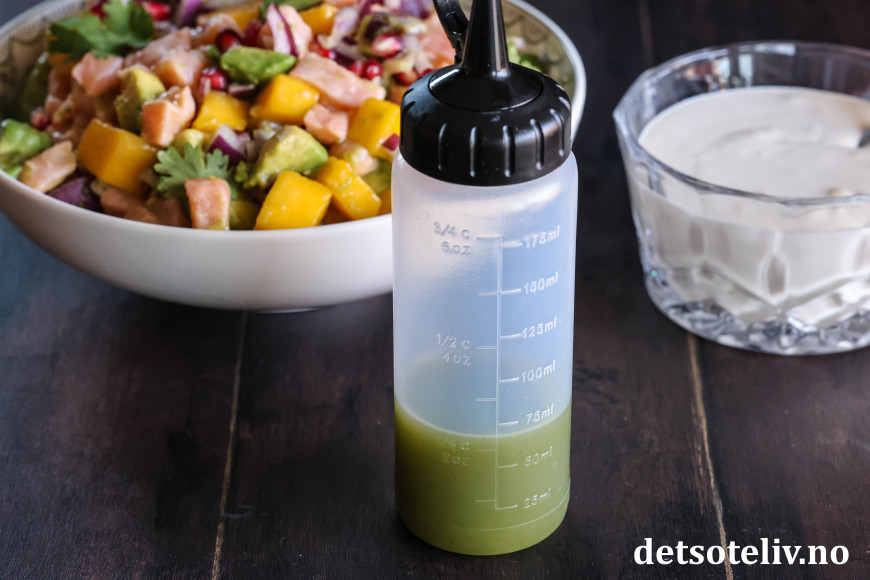 Mens laksebitene marinerer, lager du mangosalaten og korianderoljen: