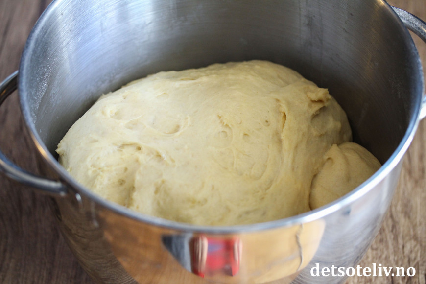 Løs opp gjæren i lunkent vann. Tilsett sukkeret og la blandingen stå og gjære i 5 minutter. Rør inn lett sammenvispede egg og olje. Bland saltet med litt av hvetemelet og rør inn. Tilsett så resten av hvetemelet og elt deigen jevn i kjøkkenmaskin i noen minutter. Dekk til deigen og la den heve lunt i 1 time.