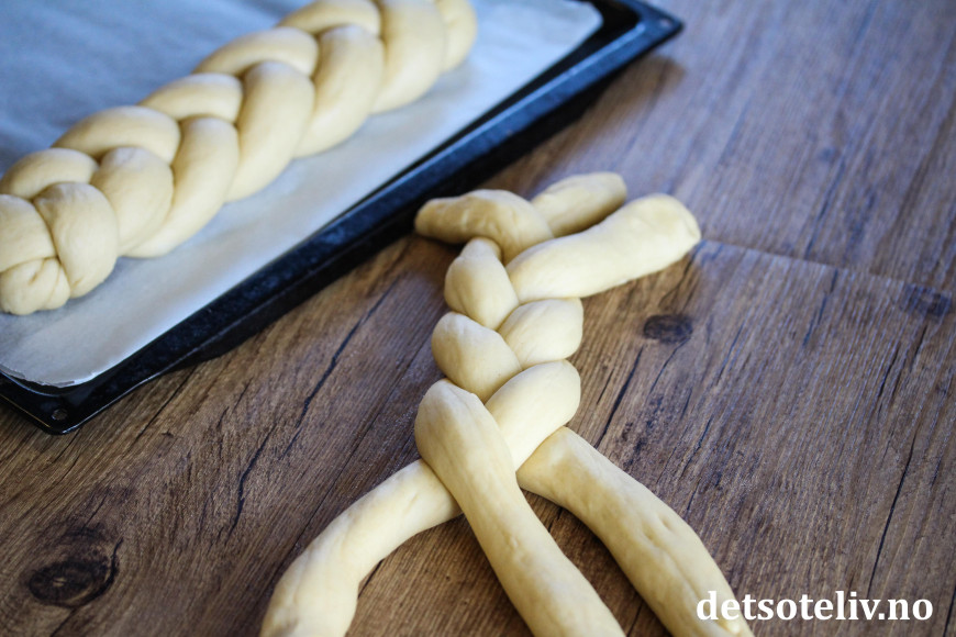 Del deigen i to like store deler. Del hver av disse i tre og trill ut lengder, som deretter formes til lubne fletter.