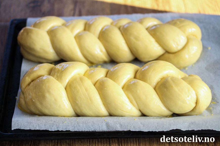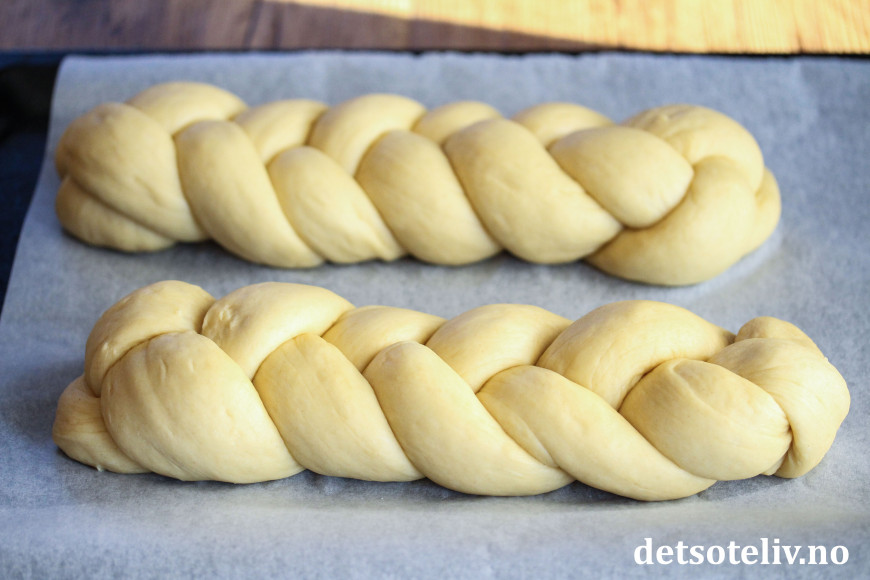 Del deigen i to like store deler. Del hver av disse i tre og trill ut lengder, som deretter formes til lubne fletter. Legg flettene på en bakepapirdekket stekeplate. La dem etterheve i 30 minutter.