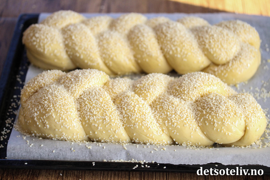 Visp egg sammen med litt melk og pensle over de hevede flettebrødene. Dryss over rikelig med sesamfrø.