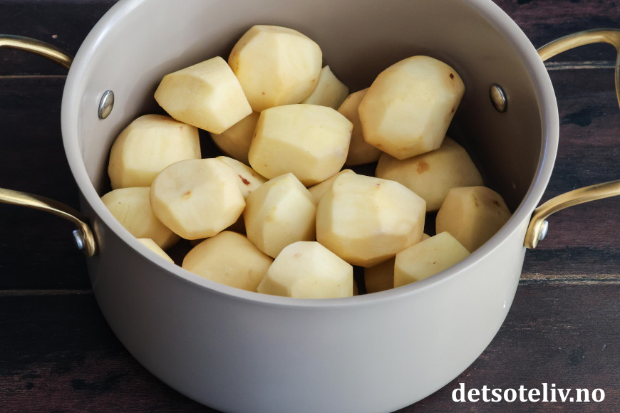Start gjerne med potetmosen: Skrell potetene og del dem opp i litt mindre biter. Ha dem i en mellomstor kjele.