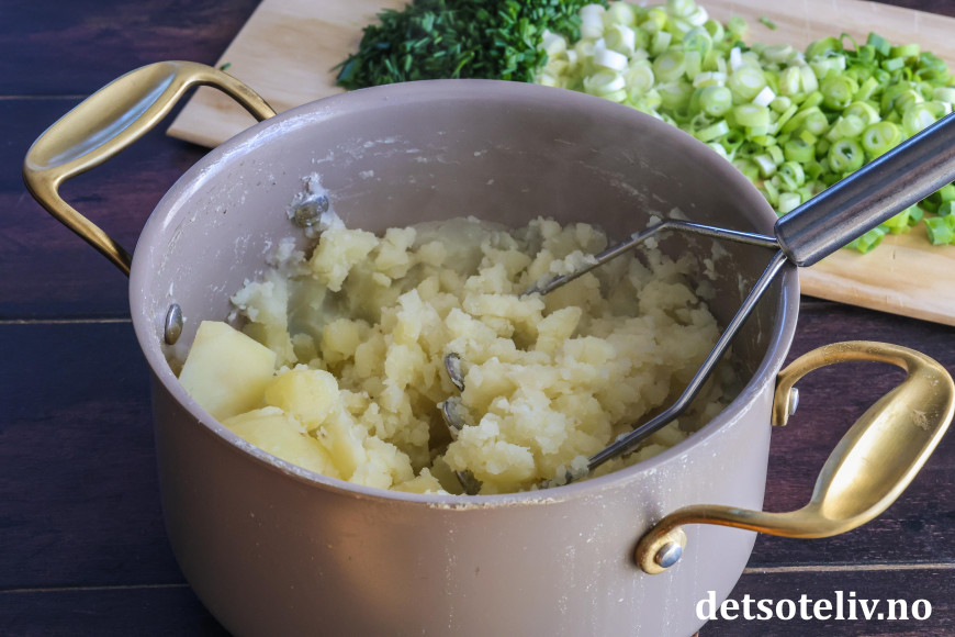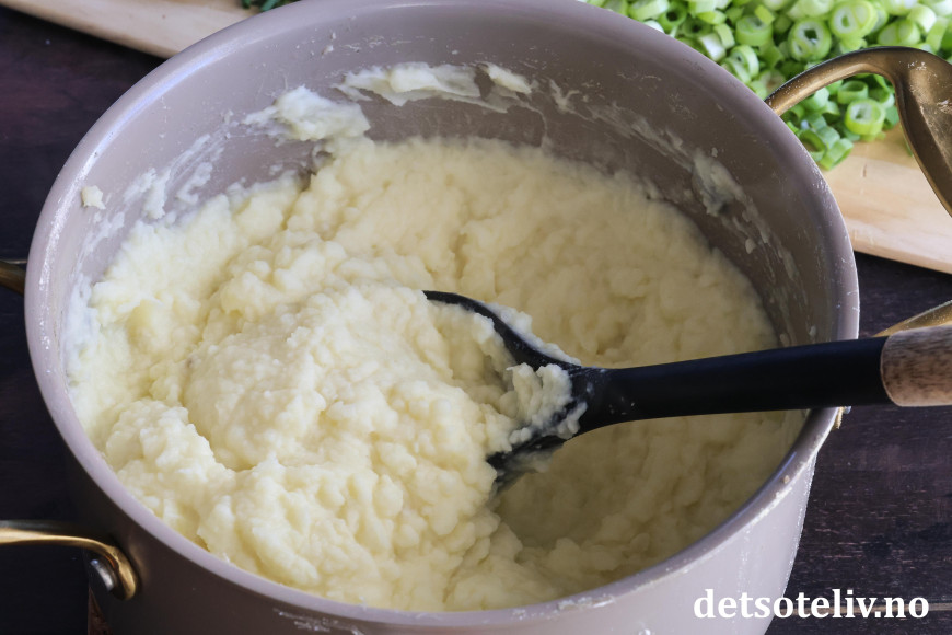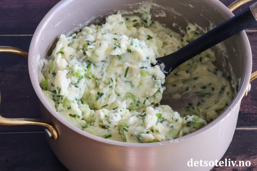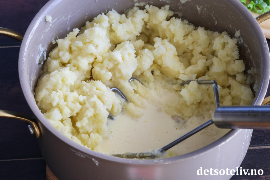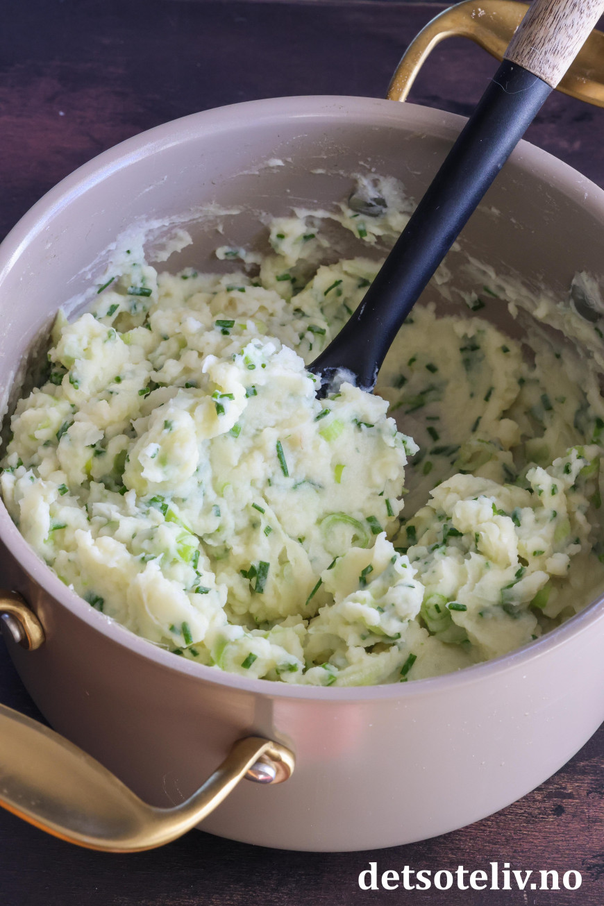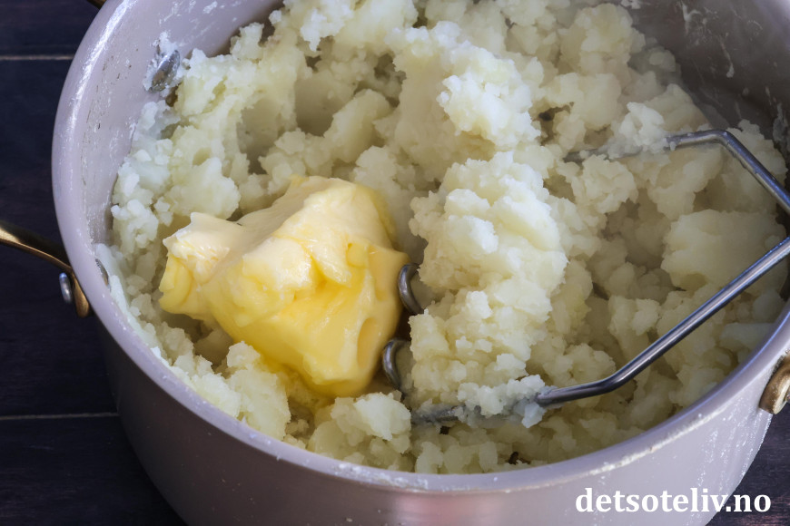 ♥ Jeg moser potetene med potetstamper som gir en veldig god konsistens på potetmosen. Ikke bruk stavmikser, for det kan gi en veldig seig potetmos.