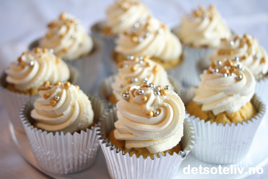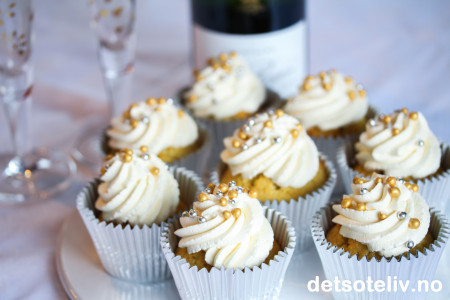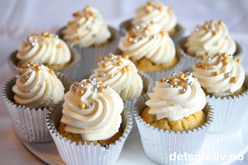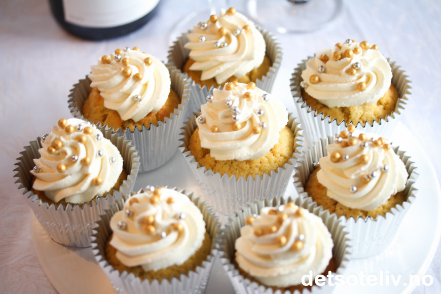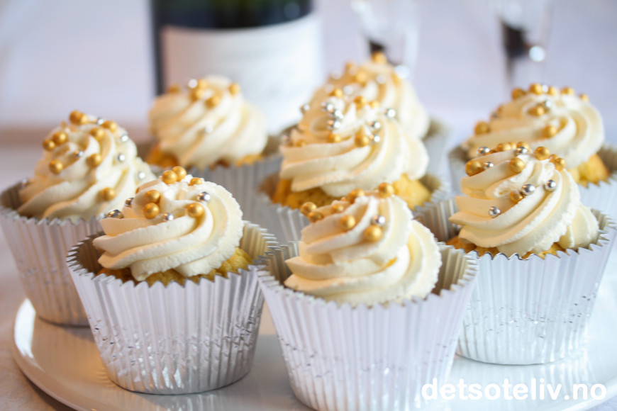 Pynt cupcakesene med sukkerperler i sølv og gullfarge for å få den feststemte stemningen.