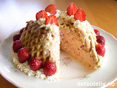 Pass på å dekke formen godt med vaffelhjerter. Da skulle det ikke være noe problem å få kaken ut av formen. Løsne kaken litt fra kanten med en tynn kniv før du hvelver den over på et fat. (Personlig pleier jeg ikke å dyppe formen i lunkent vann først, selv om det er det vanlige.)