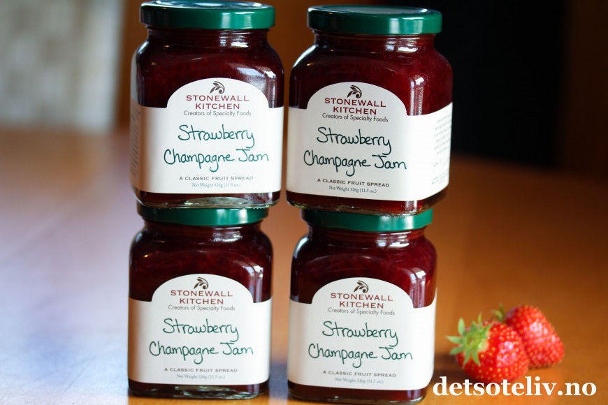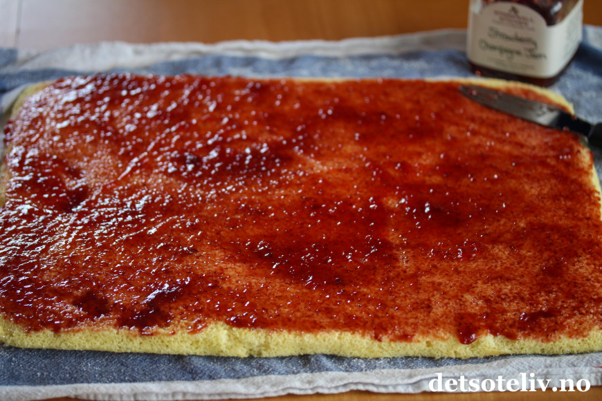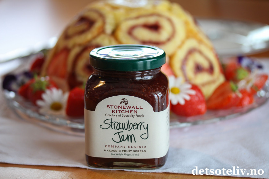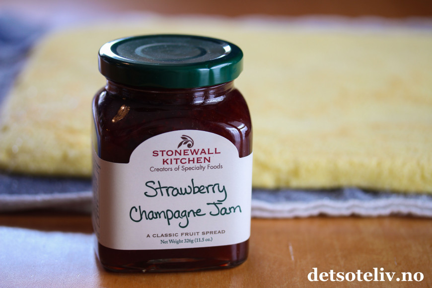 Jeg har her brukt et fantastisk godt jordbærsyltetøy med champagnesmak fra det amerikanske merket Stonewall Kitchen, som virkelig gir kaken det lille ekstra!