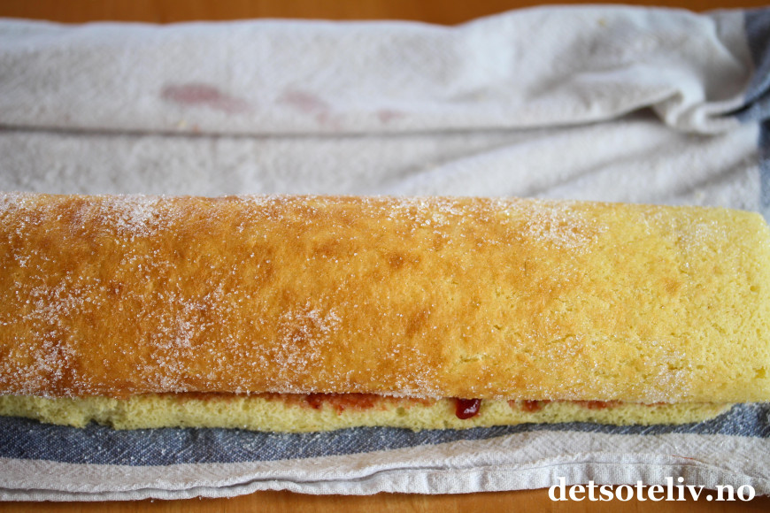 Bre deigen jevnt utover i en stor langpanne (ca. 30 x 40 cm) med bakepapir i bunnen. Stek kaken midt i ovnen ved 250°C i ca. 5 minutter. Hvelv kaken straks over på et klede som er strødd med sukker. Dra bakepapiret forsiktig av kaken (se tips). Avkjøl kaken med langpannen over slik at den holder seg myk.