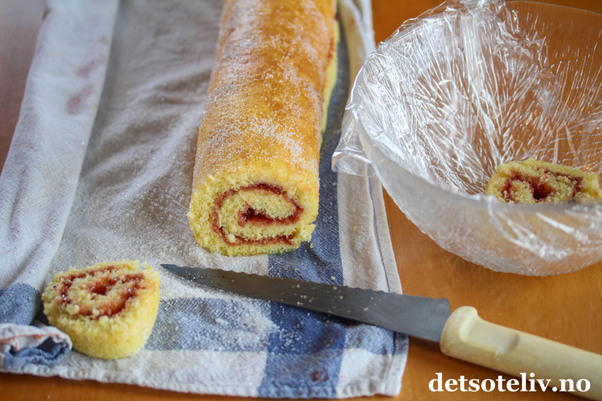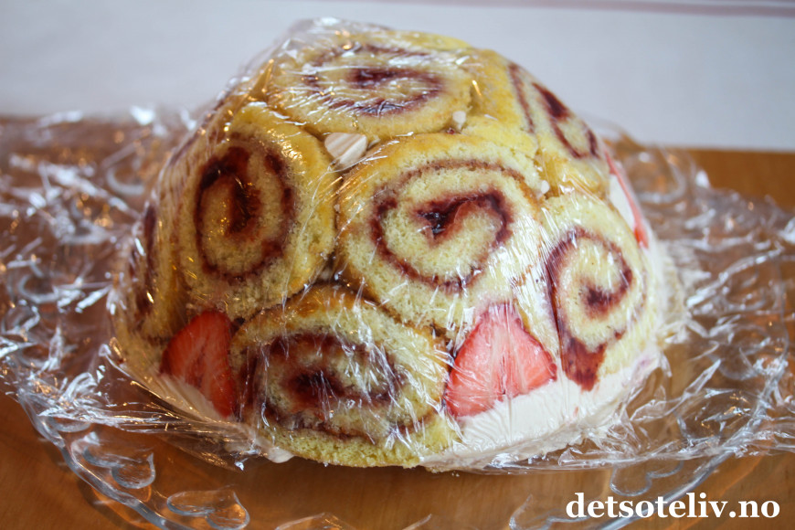 ♥ Kaken pleier å løsne fint fra glassbollen dersom du passer på å legge rullekakeskivene helt tett inntil hverandre. Jeg foretrekker likevel å kle glassbollen med tynn plastfolie (gladpack) før jeg legger i rullekakeskivene. Folien dras forsiktig av kaken etter at du har hvelvet den over på fatet. Da er du garantert bra resultat!