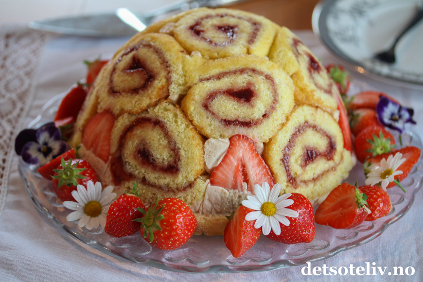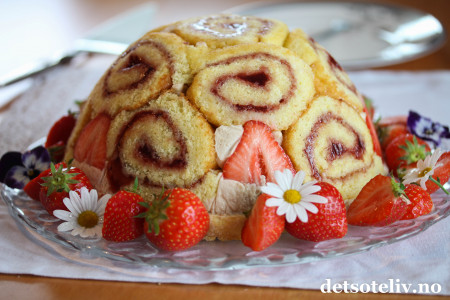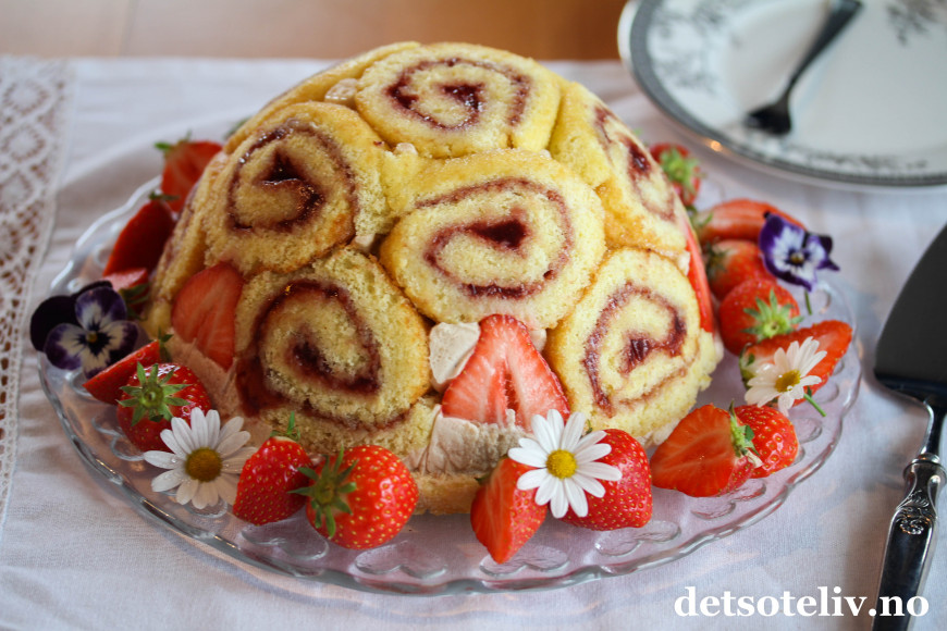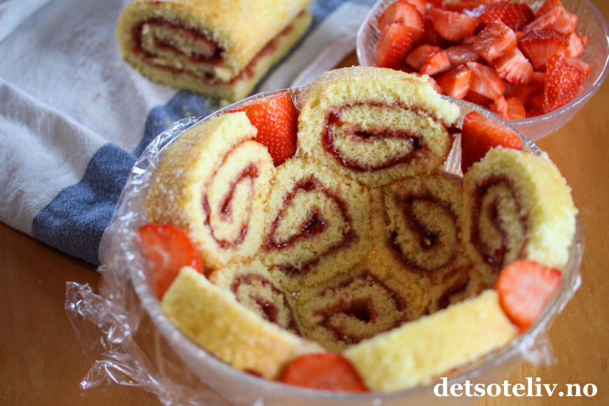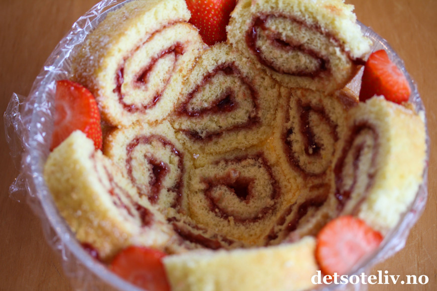 Du kan eventuelt også legge noen halve jordbær i mellomrommene mellom rullekakeskivene.