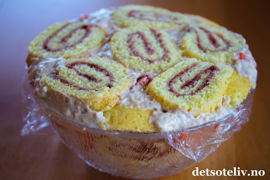Kle innsiden av en glassbolle som rommer ca 2,5 liter med plastfolie og legg deretter i rullekakeskivene så mest mulig av bollen blir dekket (se tips).