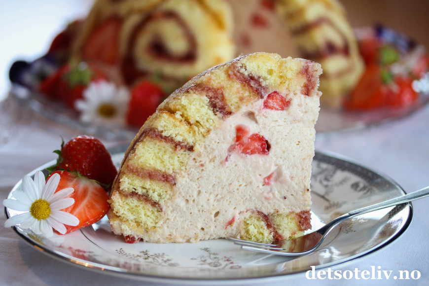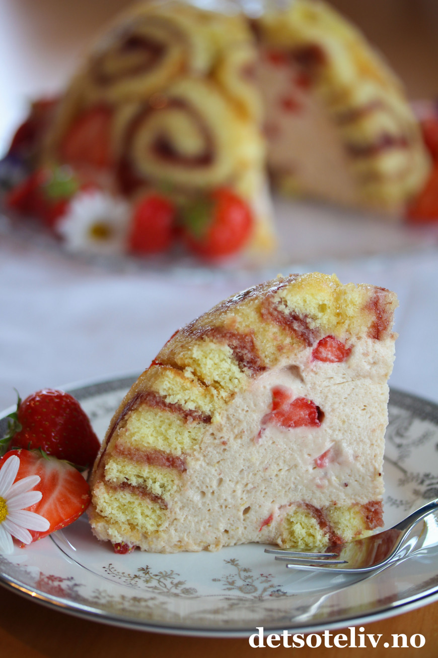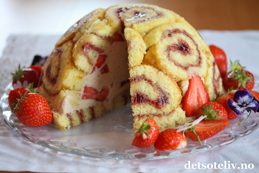 Charlotte Royale er en berømt kuppelformet kake som består av rullekakeskiver og fromasjfyll. Kaken kalles også ofte for Charlotte Russe (se for eksempel denne oppskriften som jeg har fylt med sitronfromasj og denne med skogsbærfromasj). Men her har jeg altså fylt kaken med en luftig jordbærfromasj og i rullekaken har jeg brukt jordbærsyltetøy.