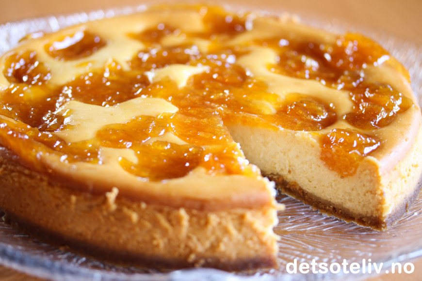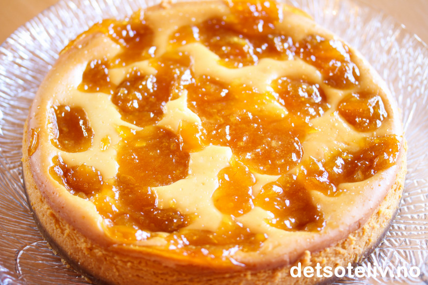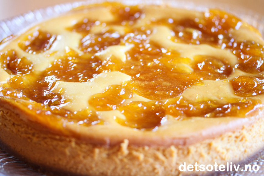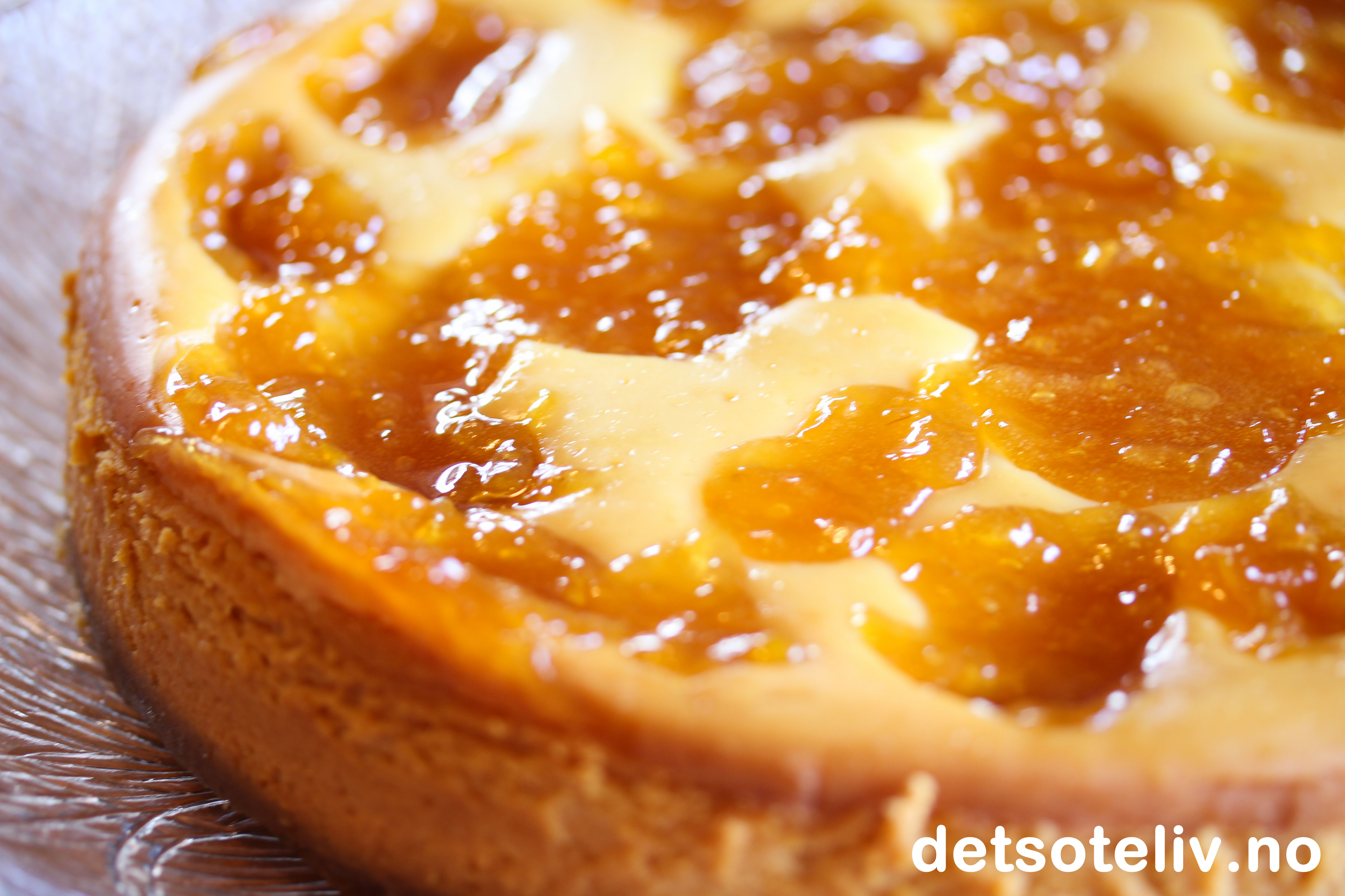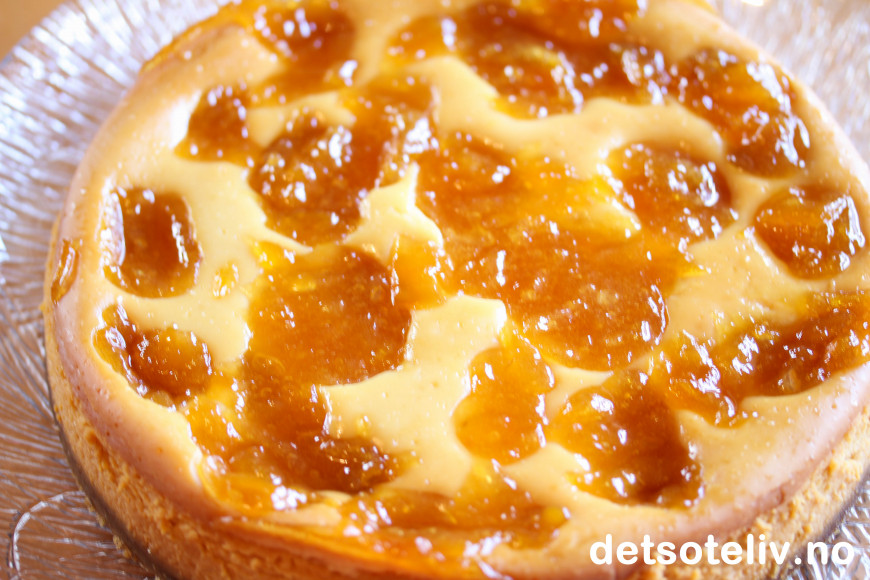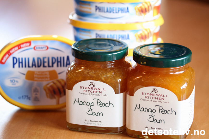 Jeg har brukt den nye typen Philadelfia kremost med honning, som egner seg supert til å lage ostekake med. I tillegg har jeg brukt et nydelig syltetøy fra Stonewall Kitchen med mango og fersken. Dette er smaker som går veldig godt i lag.