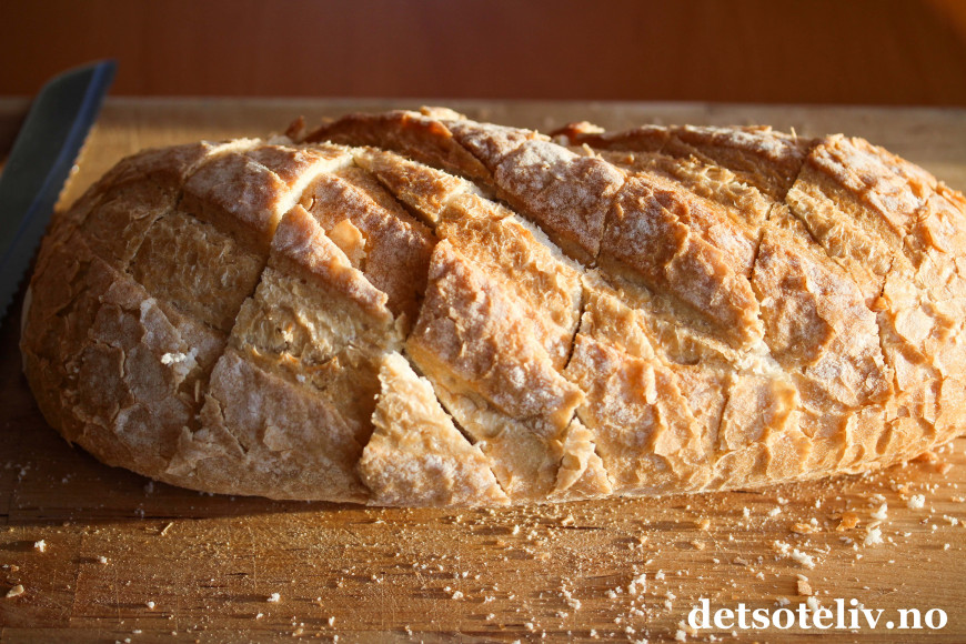Lag dype snitt i loffen med en kniv slik at du får et rutemønster på toppen. Ikke skjær helt igjennom, for loffen skal henge sammen i bunnen.