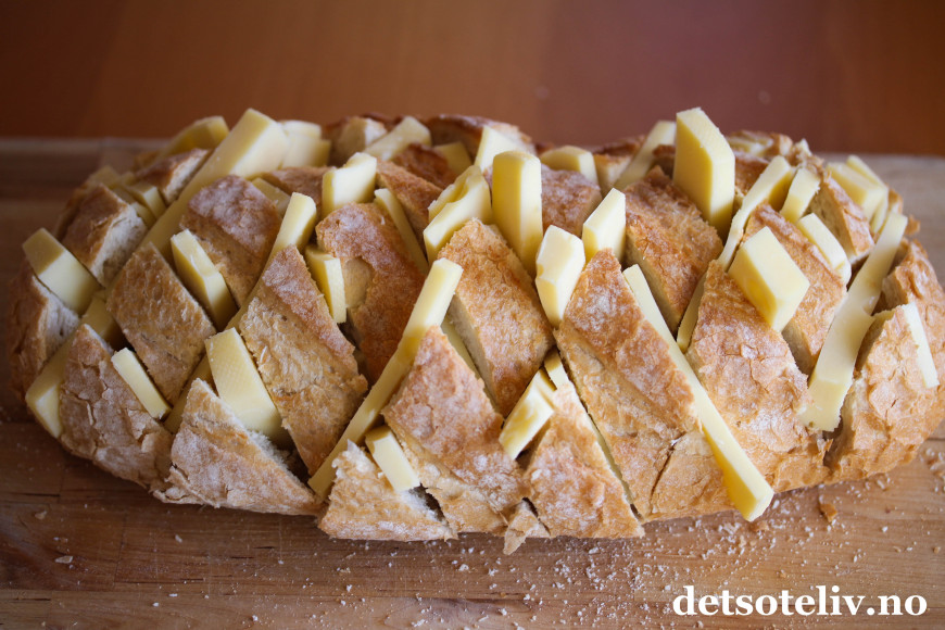 "Cheezy Bread" har blitt mer og mer populært, både fordi det ser stilig ut på bordet og ikke minst fordi det smaker så godt! Dette er dessuten utrolig lettvint å lage, og består rett og slett av en hel loff som skjæres opp i ruter på toppen og som deretter stikkes full av smør og ost. Ved steking smelter selvsagt smøret og osten og trekker godt inn i brødet, som dermed blir supersaftig... Høres godt ut, ikke sant?