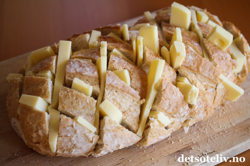 Stikk osteskivene og hvitløksskivene i sprekkene mellom rutene på loffen.