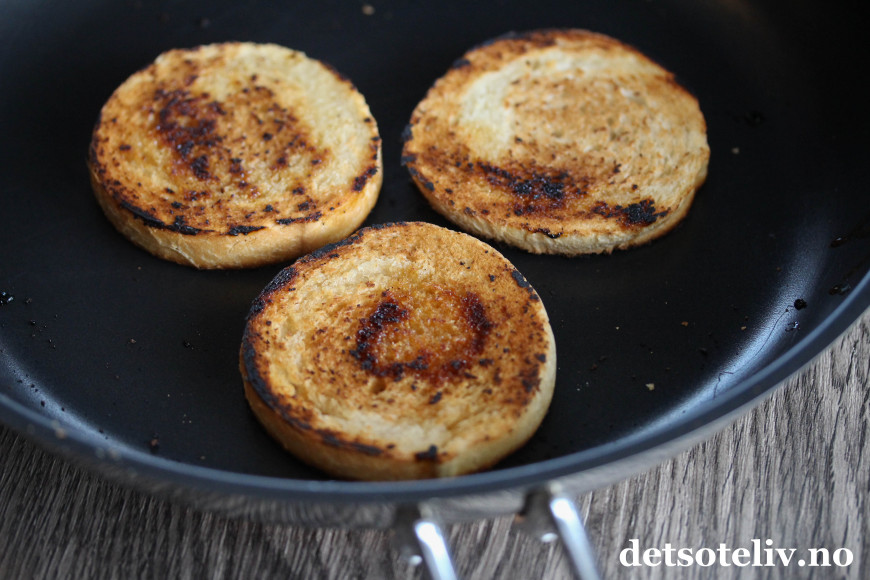 Legg dem i en tørr stekepanne og stek dem til de begynner å farge. Ringle deretter over honning på hver toastskive og stek dem videre. Snu rundt på dem ofte og pass på så de ikke blir brente, men de skal få god farge og være litt karamelliserte i kantene på grunn av honningen.