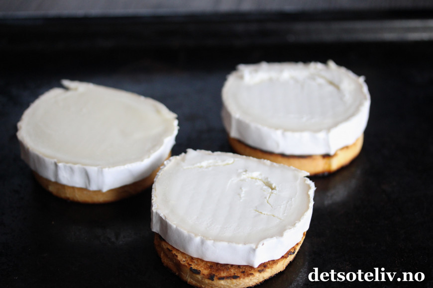 Legg toastskivene på en stekplate. Skjær tykke skiver av en stor, rund chèvre og legg på hver toastskive.