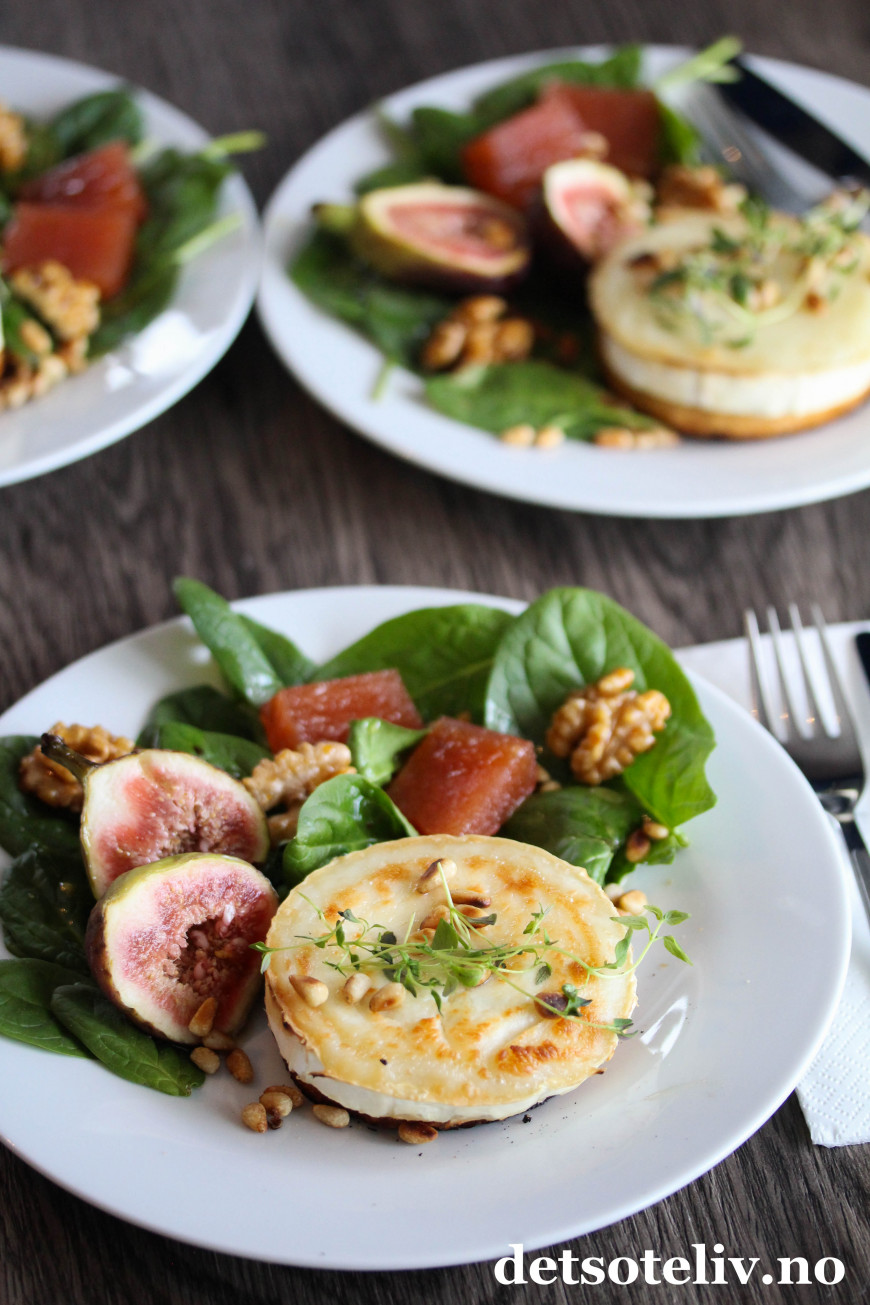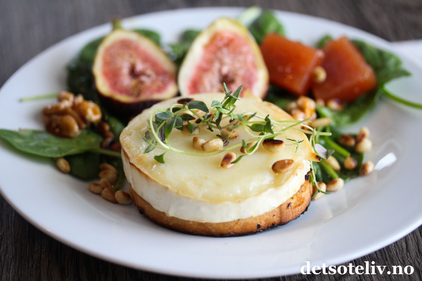 En klassisk Chèvre chaud serveres på sprø toast og sammen med deilig tilbehør: Ferske fiken, ristede pinjekjerner, karamelliserte valnøtter og noen få saladblader som drysses med hjemmelaget sennepsvinaigrette som dressing. Jeg brukte også en kjempegod kvedegelé. Så toppes det hele med flytende honning og en liten kvast frisk timian.