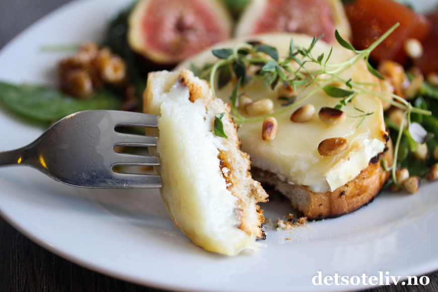 I dag blir det en herlig, fransk klassiker på Det søte liv. "Chèvre chaud" betyr "varm geitost", og her snakker vi hvit geitost av den ekte, franske varianten! Jeg bruker chèvre av merket Soignon, som har perfekt avbalansert chèvresmak - ikke for sterk og ikke for svak. Det fine med chèvren fra Soignon er dessuten at den fås kjøpt sylinderformet (både i stor og mindre varianter), som er svært så hendig, for da er det bare å skjære rullen i tykke skiver før oppvarming.