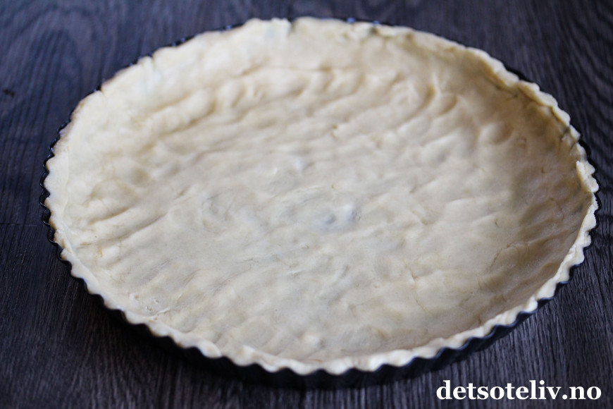 Spray en paiform (24 cm i diameter) med formfett og trykk deigen jevnt utover i formen.