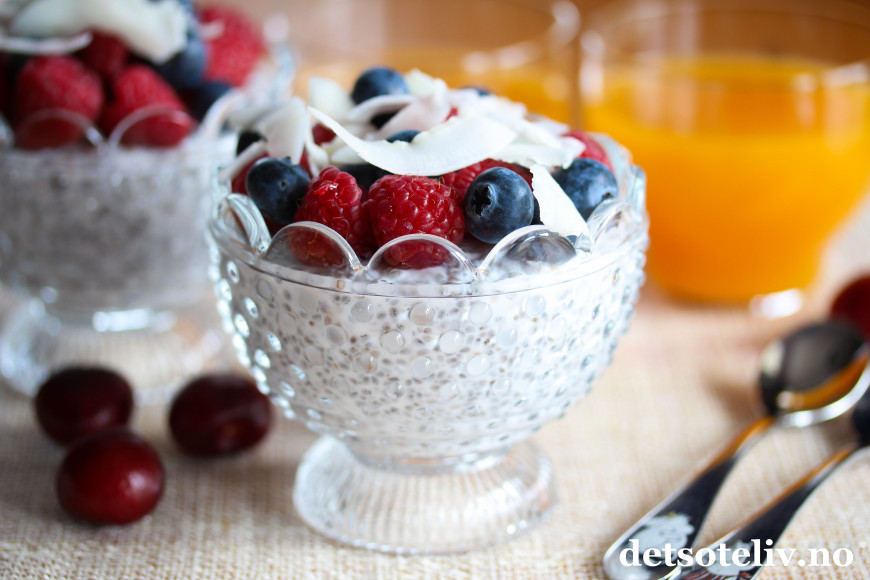 Her har jeg blandet chiafrø med kokosmelk, og serverer den ferdige chiapuddingen med friske bær og kokosflak.