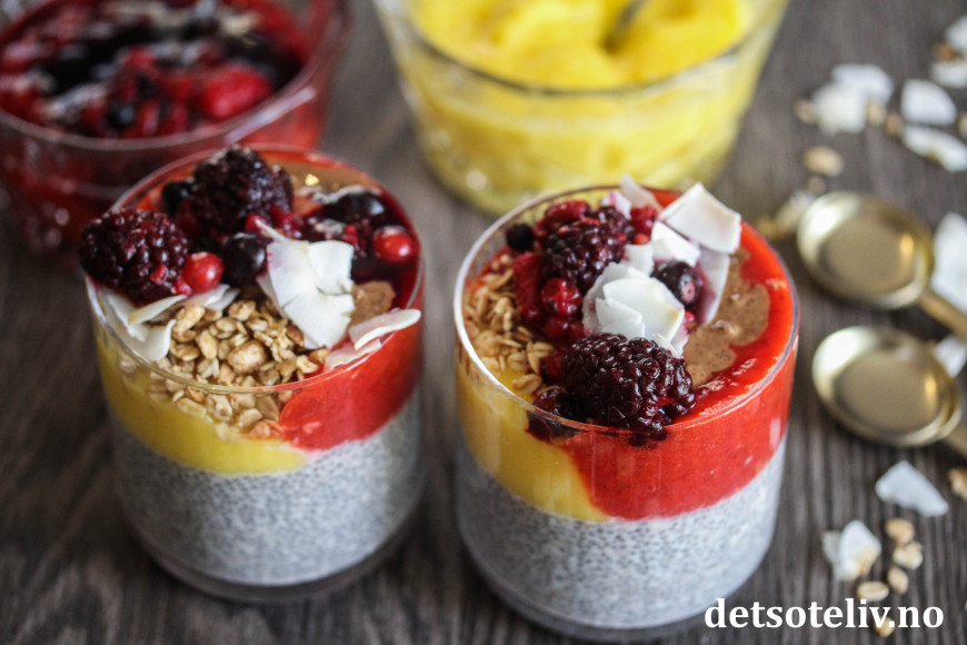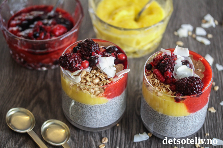 Chiapuddingen kan gjøres enda sunnere med næringsrike toppinger, og man kan variere med man har for hånden av bær, frukt, nøtter og frø. Her har jeg toppen med hjemmelaget mangosaus, jordbærsaus, granola, kokosflak, bær og mandelsmør. Dette er ikke bare sunt, men å, så godt!