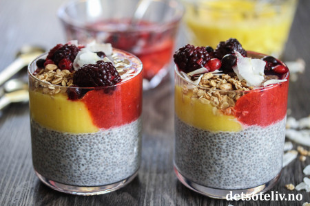 Ta chiapuddingene ut av kjøleskapet og legg på mango og jordbærsaus.