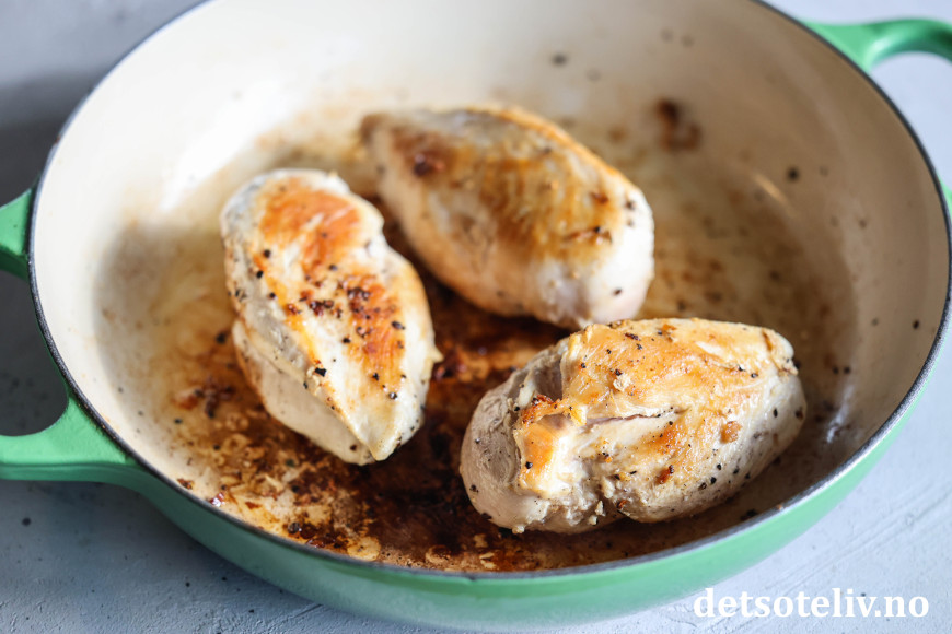 ♥ Vær nøye på at kyllingfiletene ikke blir for mye stekt. De skal være gjennomstekt, men ikke steke så lenge at de blir tørre inni. I stedet for å ha dem i stekeovnen, kan du steke dem ferdige i pannen. Ha i så fall på lokk og stek dem på middels varme etter at du har brunet dem (total steketid ca. 15 minutter, men dette vil variere med tykkelsen på kyllingfiletene).